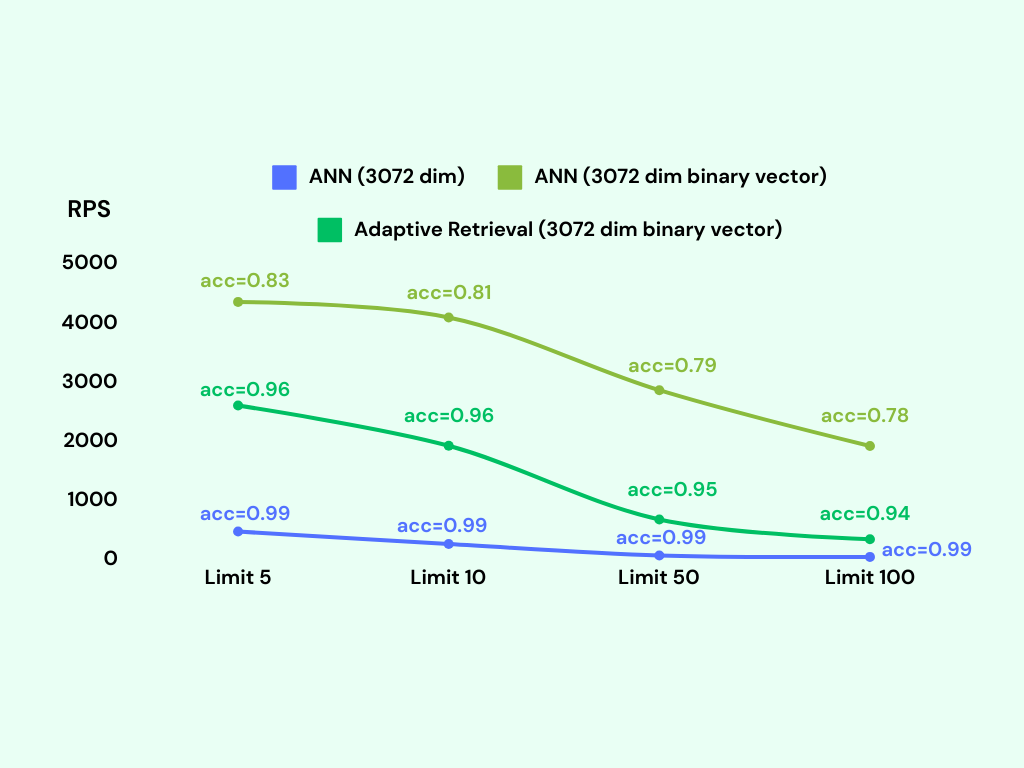 The binary vector index with adaptive retrieval achieves an accuracy of around 95%, with only a slight decrease in RPS compared to the binary vector index without adaptive retrieval. Remarkably, the memory usage of the binary vector index with adaptive retrieval is only around 600MB, which is the same as the binary vector index without adaptive retrieval.